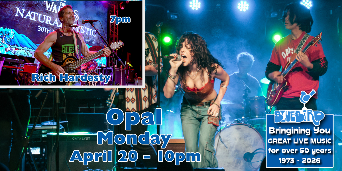 OpalWed Apr 1510:00PMat Bluebird Nightclub21+, $10.00Classic Rock Share Event Buy Tickets The Free RidersThu Apr 1610:00PMat Bluebird Nightclub21+, $5.00Classic Rock Share Event Buy Tickets Johnny SockoFri Apr 178:00PMat Bluebird Nightclub21+, $20.00Ska Share Event Buy Tickets Molly TuttleSat Apr 18Molly TuttleThe Band Loula8:00PMat Bluebird Nightclub21+, $25.00-$30.00Bluegrass Share Event Buy Tickets Rich HardestyMon Apr 207:00PMat Bluebird Nightclub21+, $10.00Classic Rock Share Event Buy Tickets OpalMon Apr 2010:00PMat Bluebird Nightclub21+, $10.00Classic Rock Share Event Buy Tickets Rod Tuffcurls & The BenchpressWed Apr 2210:00PMat Bluebird Nightclub21+, $10.00Classic Rock Share Event Buy Tickets Welcome to the NeighborhoodFri Apr 249:00PMat Bluebird Nightclub21+, $10.00Rock Share Event Buy Tickets Jukebox LukeSat Apr 257:00PMat Bluebird Nightclub21+, $10.00Rock Share Event Buy Tickets The Boys and the BritFri May 19:00PMat Bluebird Nightclub21+, $10.00Classic Rock Share Event Buy Tickets 123